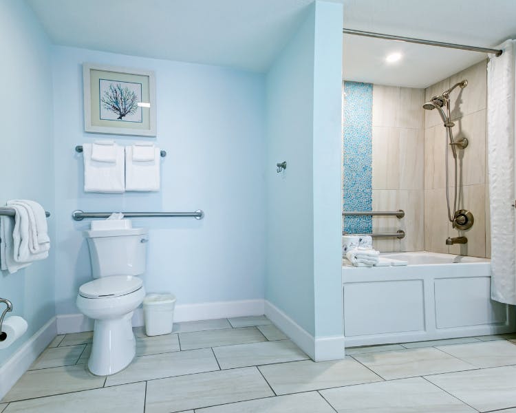 Our Accessible Oceanfront 1 Bedroom is designed with wheelchair-accessible clearances, grab bars for the toilet & shower, & tub with seat. This room does not offer hearing accessible options.